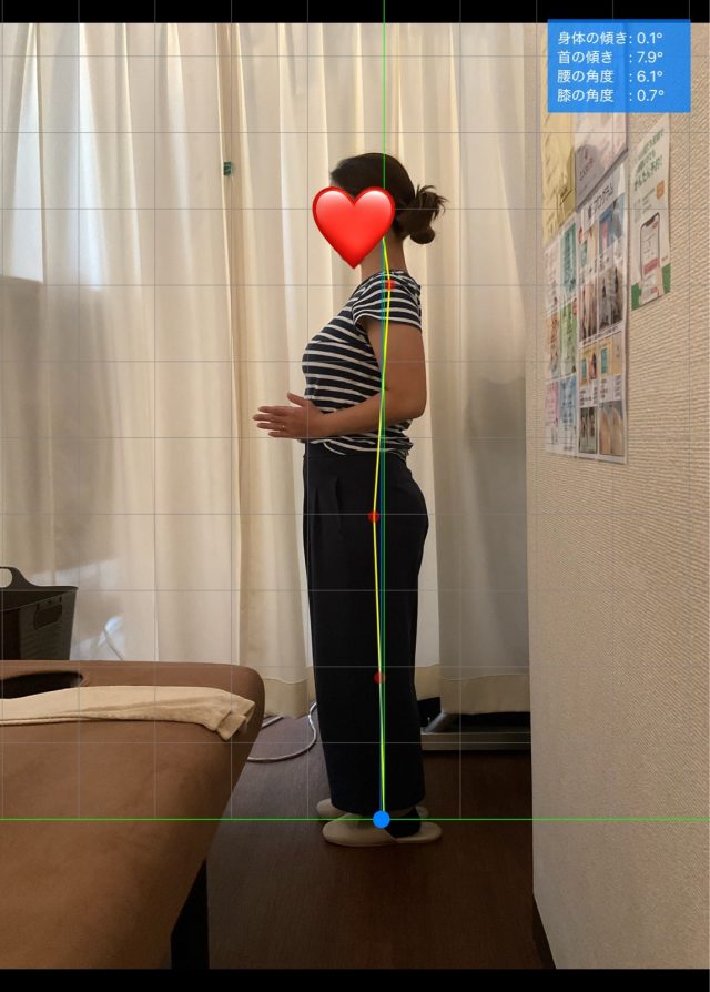 頭部前方偏位。胸椎後弯、腰椎前弯が見られます。写真では目立ちませんが触診で正確に分かります。